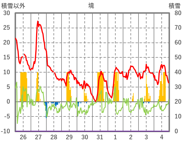 | 日 | 時 | 気温 | 降水 | 風向/風速 | 日照 | 積雪 | 降雪 |