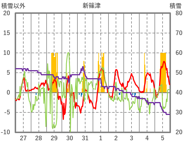 | 日 | 時 | 気温 | 降水 | 風向/風速 | 日照 | 積雪 | 降雪 |