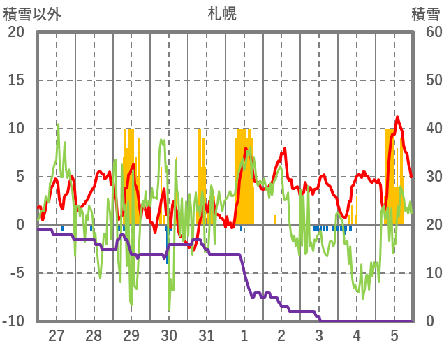 | 日 | 時 | 気温 | 降水 | 風向/風速 | 日照 | 積雪 | 降雪 |