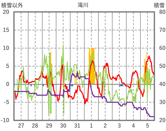 | 日 | 時 | 気温 | 降水 | 風向/風速 | 日照 | 積雪 | 降雪 |