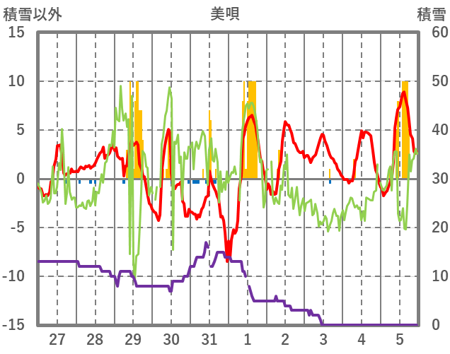 | 日 | 時 | 気温 | 降水 | 風向/風速 | 日照 | 積雪 | 降雪 |