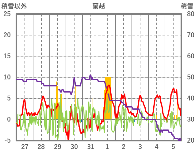 | 日 | 時 | 気温 | 降水 | 風向/風速 | 日照 | 積雪 | 降雪 |
