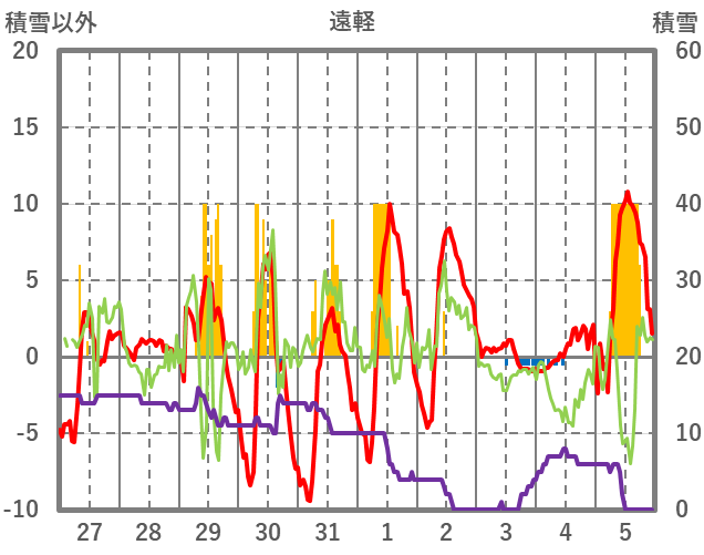 | 日 | 時 | 気温 | 降水 | 風向/風速 | 日照 | 積雪 | 降雪 |