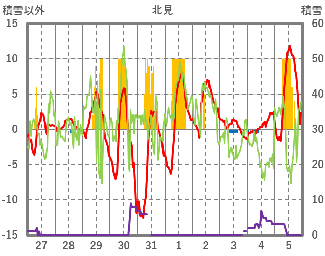 | 日 | 時 | 気温 | 降水 | 風向/風速 | 日照 | 積雪 | 降雪 |