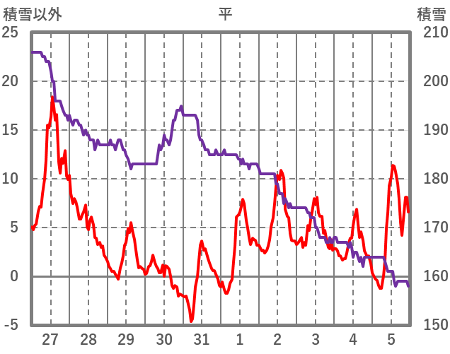 | 日 | 時 | 気温 | 降水 | 風向/風速 | 日照 | 積雪 | 降雪 |