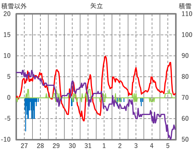 | 日 | 時 | 気温 | 降水 | 風向/風速 | 日照 | 積雪 | 降雪 |