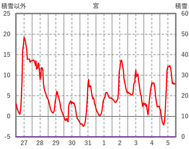 | 日 | 時 | 気温 | 降水 | 風向/風速 | 日照 | 積雪 | 降雪 |