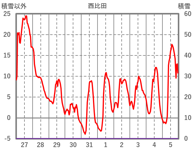 | 日 | 時 | 気温 | 降水 | 風向/風速 | 日照 | 積雪 | 降雪 |