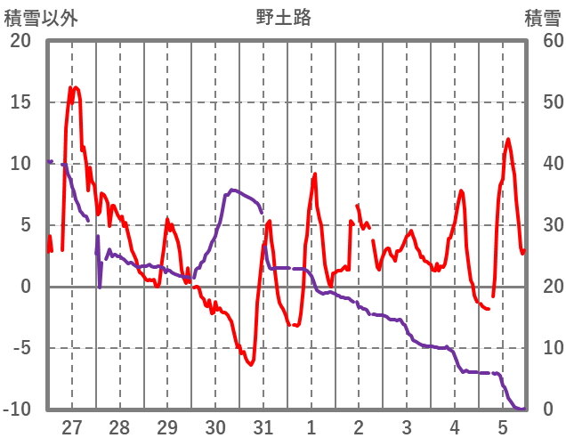 | 日 | 時 | 気温 | 降水 | 風向/風速 | 日照 | 積雪 | 降雪 |