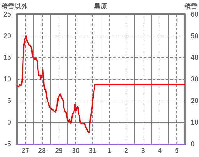 | 日 | 時 | 気温 | 降水 | 風向/風速 | 日照 | 積雪 | 降雪 |