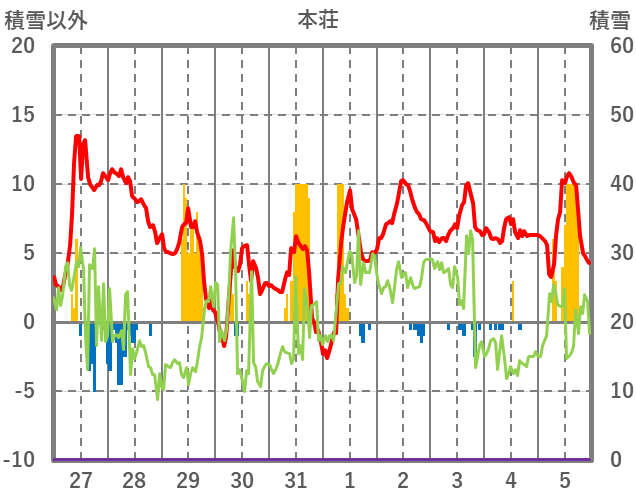 | 日 | 時 | 気温 | 降水 | 風向/風速 | 日照 | 積雪 | 降雪 |