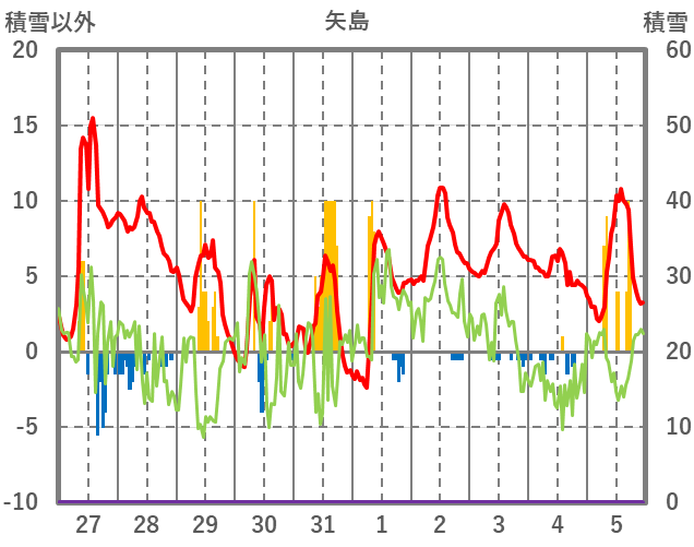 | 日 | 時 | 気温 | 降水 | 風向/風速 | 日照 | 積雪 | 降雪 |