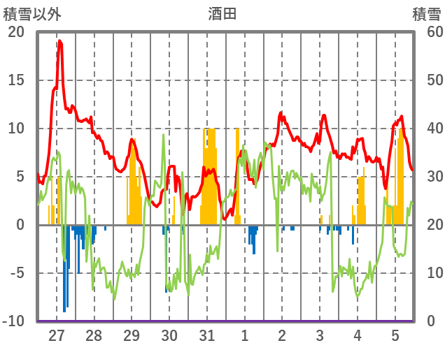 | 日 | 時 | 気温 | 降水 | 風向/風速 | 日照 | 積雪 | 降雪 |