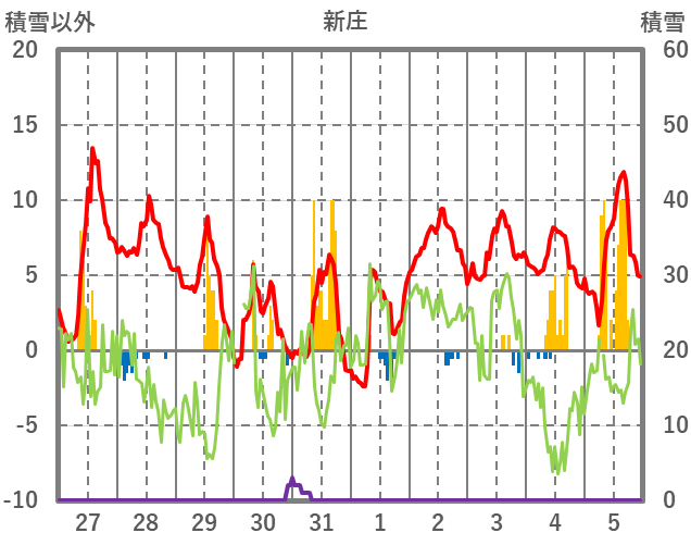 | 日 | 時 | 気温 | 降水 | 風向/風速 | 日照 | 積雪 | 降雪 |