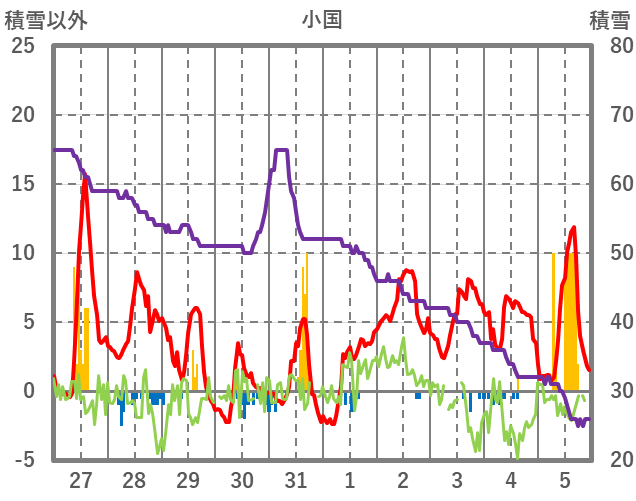 | 日 | 時 | 気温 | 降水 | 風向/風速 | 日照 | 積雪 | 降雪 |
