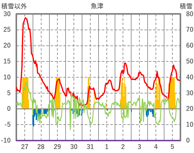 | 日 | 時 | 気温 | 降水 | 風向/風速 | 日照 | 積雪 | 降雪 |