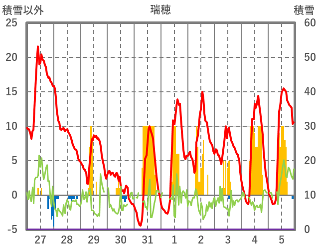 | 日 | 時 | 気温 | 降水 | 風向/風速 | 日照 | 積雪 | 降雪 |