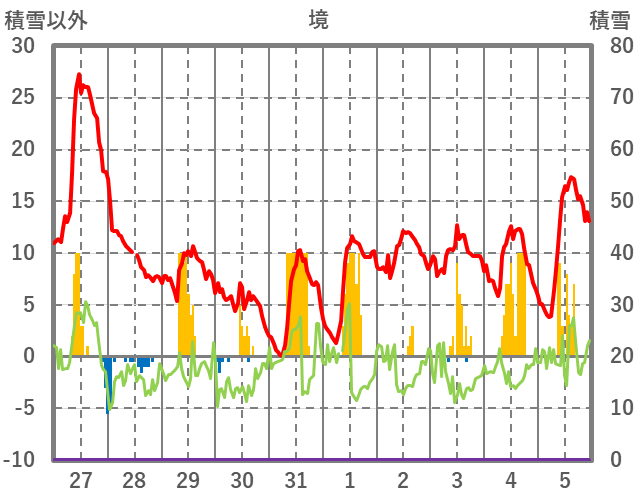 | 日 | 時 | 気温 | 降水 | 風向/風速 | 日照 | 積雪 | 降雪 |