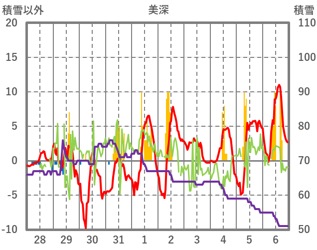 | 日 | 時 | 気温 | 降水 | 風向/風速 | 日照 | 積雪 | 降雪 |