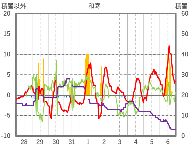 | 日 | 時 | 気温 | 降水 | 風向/風速 | 日照 | 積雪 | 降雪 |