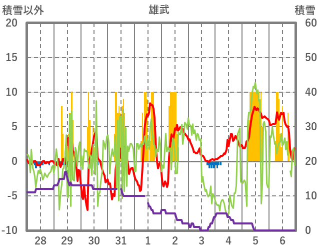 | 日 | 時 | 気温 | 降水 | 風向/風速 | 日照 | 積雪 | 降雪 |