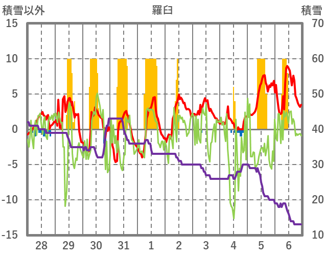 | 日 | 時 | 気温 | 降水 | 風向/風速 | 日照 | 積雪 | 降雪 |