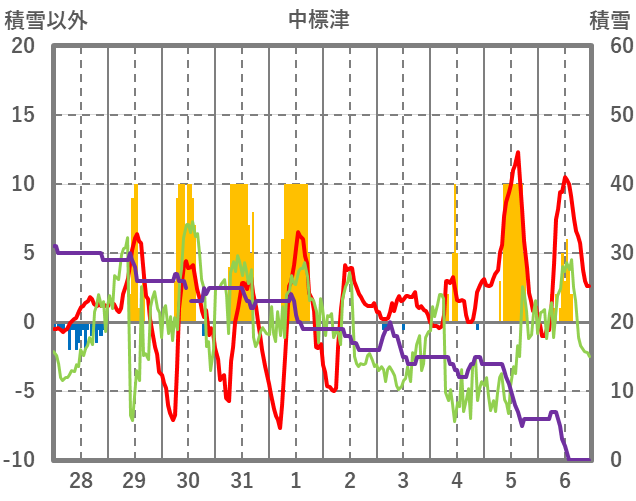 | 日 | 時 | 気温 | 降水 | 風向/風速 | 日照 | 積雪 | 降雪 |