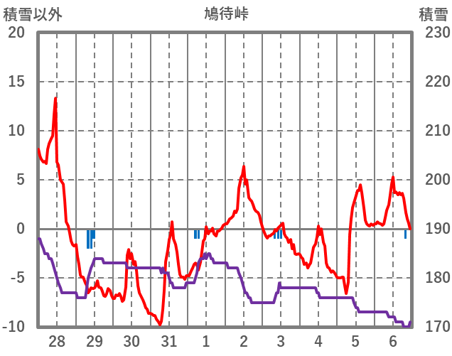 | 日 | 時 | 気温 | 降水 | 風向/風速 | 日照 | 積雪 | 降雪 |