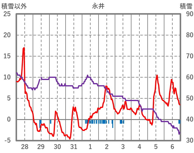 | 日 | 時 | 気温 | 降水 | 風向/風速 | 日照 | 積雪 | 降雪 |