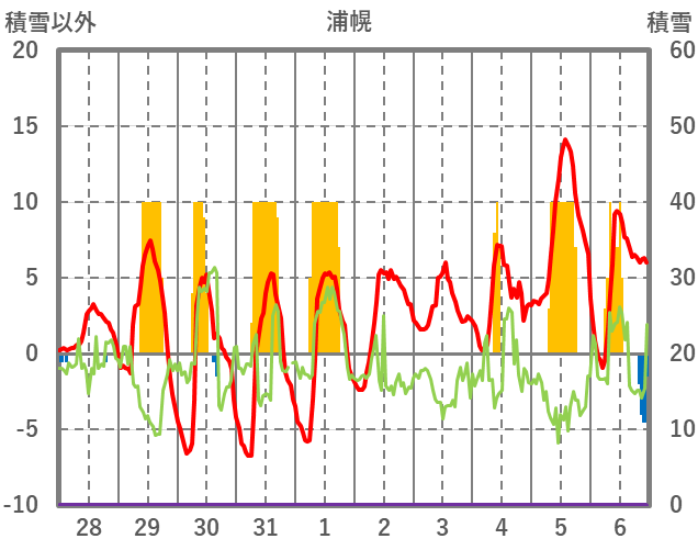 | 日 | 時 | 気温 | 降水 | 風向/風速 | 日照 | 積雪 | 降雪 |