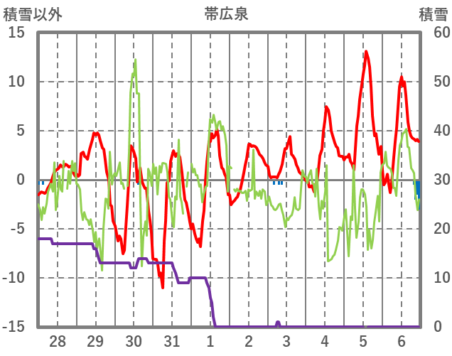 | 日 | 時 | 気温 | 降水 | 風向/風速 | 日照 | 積雪 | 降雪 |