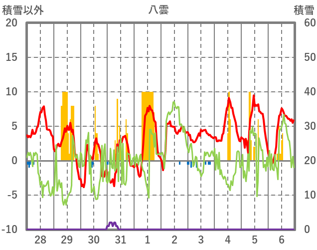 | 日 | 時 | 気温 | 降水 | 風向/風速 | 日照 | 積雪 | 降雪 |