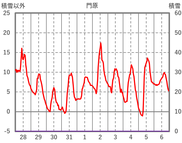 | 日 | 時 | 気温 | 降水 | 風向/風速 | 日照 | 積雪 | 降雪 |