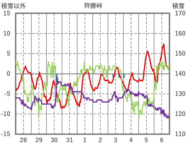 | 日 | 時 | 気温 | 降水 | 風向/風速 | 日照 | 積雪 | 降雪 |