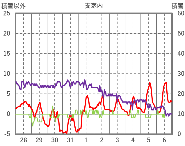 | 日 | 時 | 気温 | 降水 | 風向/風速 | 日照 | 積雪 | 降雪 |