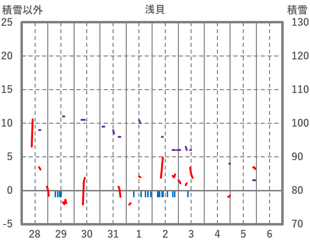 | 日 | 時 | 気温 | 降水 | 風向/風速 | 日照 | 積雪 | 降雪 |