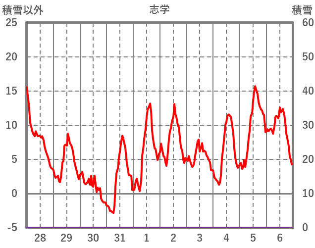 | 日 | 時 | 気温 | 降水 | 風向/風速 | 日照 | 積雪 | 降雪 |