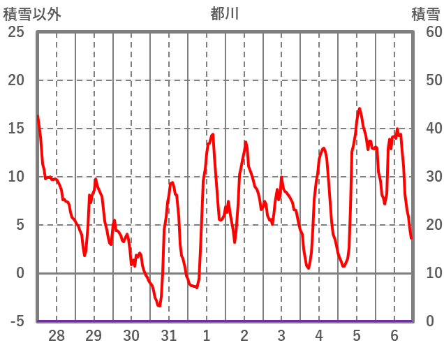 | 日 | 時 | 気温 | 降水 | 風向/風速 | 日照 | 積雪 | 降雪 |