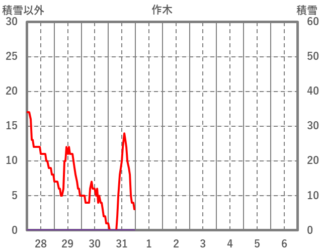 | 日 | 時 | 気温 | 降水 | 風向/風速 | 日照 | 積雪 | 降雪 |