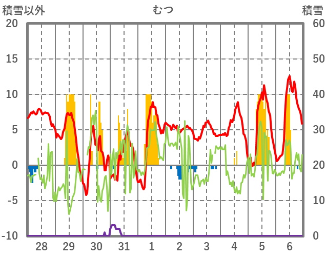 | 日 | 時 | 気温 | 降水 | 風向/風速 | 日照 | 積雪 | 降雪 |