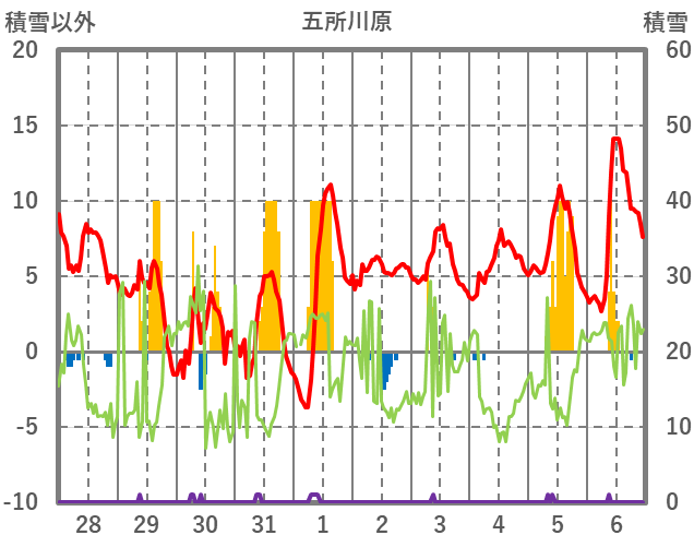 | 日 | 時 | 気温 | 降水 | 風向/風速 | 日照 | 積雪 | 降雪 |