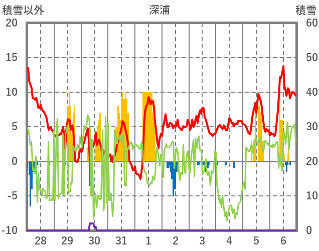 | 日 | 時 | 気温 | 降水 | 風向/風速 | 日照 | 積雪 | 降雪 |