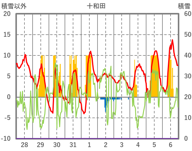 | 日 | 時 | 気温 | 降水 | 風向/風速 | 日照 | 積雪 | 降雪 |