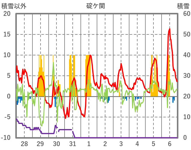 | 日 | 時 | 気温 | 降水 | 風向/風速 | 日照 | 積雪 | 降雪 |