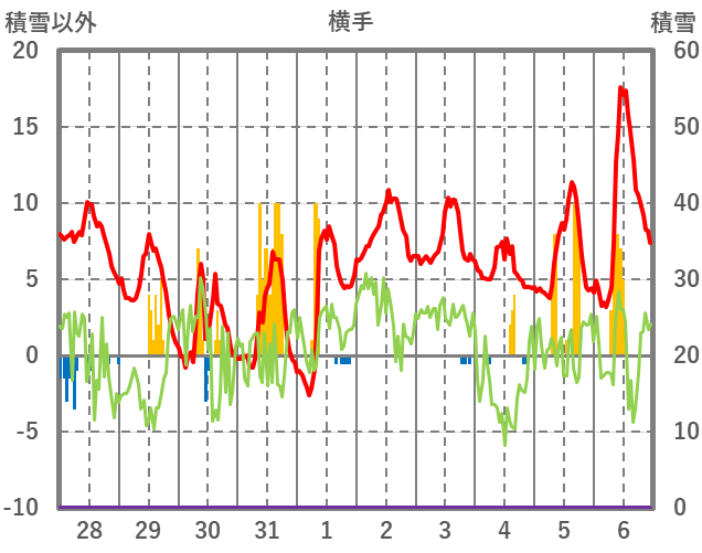 | 日 | 時 | 気温 | 降水 | 風向/風速 | 日照 | 積雪 | 降雪 |