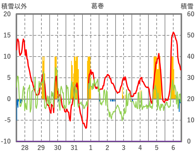 | 日 | 時 | 気温 | 降水 | 風向/風速 | 日照 | 積雪 | 降雪 |