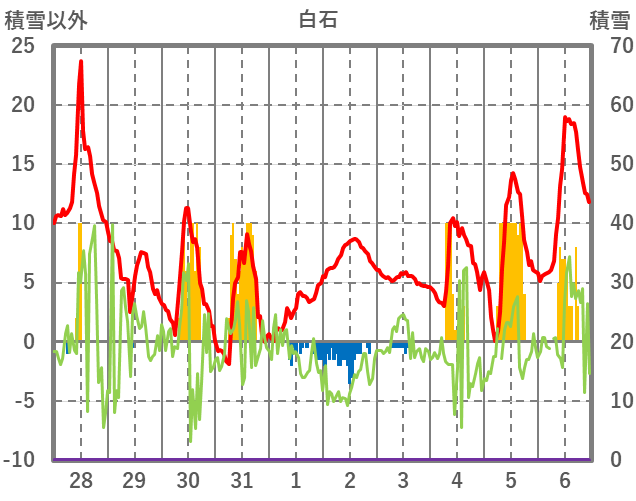 | 日 | 時 | 気温 | 降水 | 風向/風速 | 日照 | 積雪 | 降雪 |