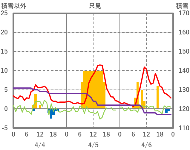 | 日 | 時 | 気温 | 降水 | 風向/風速 | 日照 | 積雪 | 降雪 |