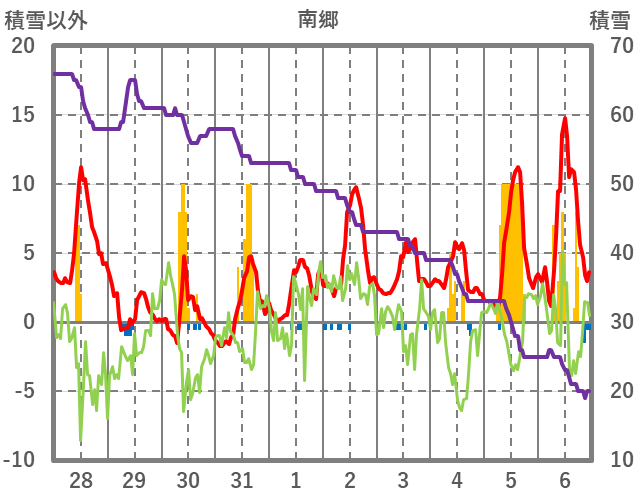 | 日 | 時 | 気温 | 降水 | 風向/風速 | 日照 | 積雪 | 降雪 |