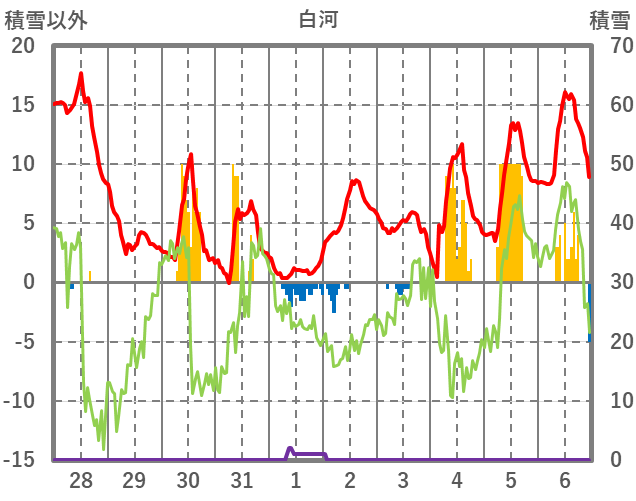 | 日 | 時 | 気温 | 降水 | 風向/風速 | 日照 | 積雪 | 降雪 |